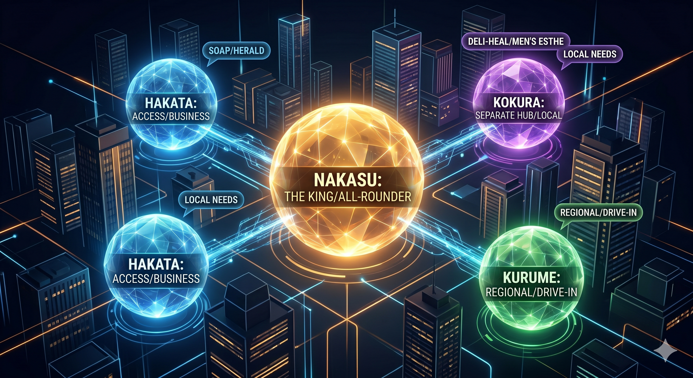 東京のように広範囲に分散しているタイプとも、大阪のように強い繁華街が複数あるタイプとも少し違い、福岡は中洲を中心にしながらも、博多・天神・小倉・久留米などに役割が分かれているのが特徴です。